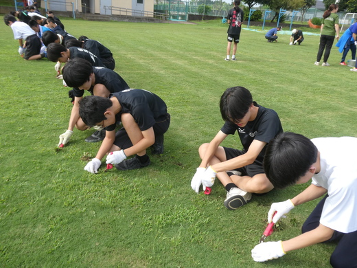 谷戸小学校地域学校共同活動主催の、雑草抜きのボランティアに、本校の生徒が参加しました。夏休み中、2日間、朝8時半から9時の30分間で、応募したボランティアの生徒と部活動単位の参加です。