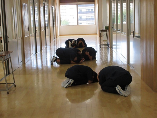 教室にいる生徒は机の中に入りますが、廊下にいる生徒は、安全な場所に移動してその場に伏せるよう、放送で指示しました。