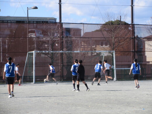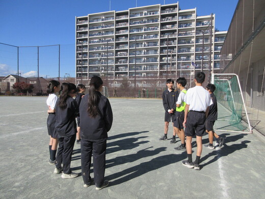 球技(ハンドボール)で「自分たちで考案した練習を行い、自チームの課題を改善できるようにする」ことを目標に研究授業を行いました。また人権教育の視点「球技の経験や運動能力には個人差があることを理解し、作戦などについて他者の考えや意見を大切にしようとすることや、一人一人の違いに応じたプレーなどを認める態度を育てる」ことを大切に行いました。