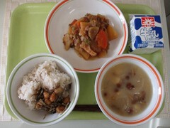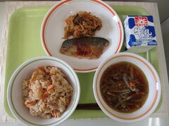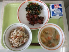 今日の給食は和食の献立です。『大豆と小魚の揚げ煮』にはいっている小魚はなんのお魚だと思いますか? 答えは「かえり煮干し」です。「かたくちいわし」の子どもを干したもので、2.5cm以下のものを「ちりめん」、4cm以下のものを「かえり煮干し」、それより大きいものが「煮干し」と呼びます。「かえり煮干し」には骨を強くするカルシウムがたっぷりはいっています。大豆と一緒に油で揚げて、食べやすい味付けになっているのでしっかり食べましょう。