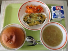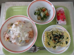 今日の給食は洋食の献立です。『トマトライスのクリームソース』はトマト風味のライスにシチューやグラタンなどに使うホワイトソースを上からかけていただきます。ホワイトソースは、小麦粉、バター、牛乳を使って作るソースでフランス料理の基本的なソースのひとつです。『キッシュ』とは、卵と生クリームを使った料理です。パイ生地やタルト生地の中に、ハム、野菜、チーズを加えた卵液をいれてオーブンで焼きます。給食では、パイ生地は使わず、カップにいれて中身を焼きました。よく味わって食べましょう。