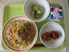 『サンマーメン』とは神奈川県横浜市発祥の麺料理で、とろみをつけたスープに肉や野菜を炒めたものがはいったラーメンです。もやしや必ず入れるそうで、魚のさんまははいっていません。とろみをつけることでスープが冷めにくいです。『豆腐団子のあんかけ』は豆腐と鶏ひき肉、ちりめんじゃこ、にんじん、長ねぎがはいったお団子に、トマト風味のたれをかけています。具たくさんのお団子で栄養満点です。よくかんで食べましょう。