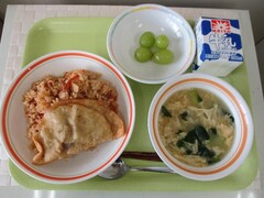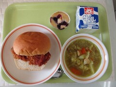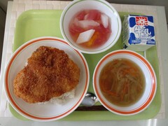 今日の給食は明日本町小学校が運動会のため、応援献立になります。『カツ丼』にはいっている豚肉は、ごはんに含まれている糖質をエネルギーに変えるビタミンB1が多く含まれています。全食品の中でもビタミンB1の含有量は食品の中でもトップクラスです。疲労回復に効果があり、体や頭の疲れをとるのを助けてくれます。また、筋肉や骨をつくるのに良質なたんぱく質も豊富に含まれています。よくかんで、味わって食べましょう。