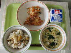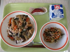 今日の給食は和食の献立です。『秋の香りごはん』には秋が旬の栗、しめじ、えのきたけ、まいたけの食材がはいっています。栗は日本では、昔から食べられていました。縄文時代には主食となり栽培されていたことがわかっています。栗の甘みときのこのうま味が味わえるごはんに仕上がっています。『こっぱなます』とは、福井県の郷土料理です。木を切る時や削る時に出てくる木くずのことを「こっぱ」と呼び、食材を切った形が「こっぱ」に似ていることから『こっぱなます』という名前が付けられました。よく味わって食べましょう。