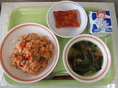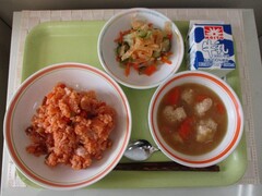 今日の給食は洋食の献立です。『ジャンバラヤ』はアメリカの南部で開拓時代から食べられている炊き込みごはんです。スペイン料理のパエリアをもとに作られた料理で、少しスパイスがきいた味になっています。給食では、ソーセージや野菜をいれ、トマトソースで味を付けました。『いかのオーロラソースかけ』には、揚げたイカにマヨネーズとケチャップを合わせた「オーロラソース」をかけていただきます。よくかんで食べましょう。