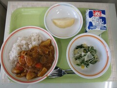 日本は海に囲まれているため、昔からわかめや昆布などの海藻を食べてきました。『茎わかめのごま風味』の「茎わかめ」とは、わかめの真ん中を縦に通っている太い芯の部分で、コリコリした歯ごたえがあります。食物繊維や特有のぬめりのある成分が含まれていて、体に余分な塩分を体の外に出す働きがあります。今日は他の野菜と一緒に合わせて、ごま風味の味付けにしました。デザートの『焼きりんご』は切ったりんごに砂糖、バター、ほんの少しシナモンをいれてオーブンで焼きました。しっかり食べて今週も元気に過ごしましょう。