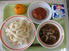 餃子はもともと中国から日本に伝わってきた料理で、今では日本各地にご当地餃子が登場するくらいの人気です。中国では縁起の良い食べ物とされていて、旧正月やお祝いの席で食べられるそうです。今日の給食では、豚ひき肉、みじん切りにしたキャベツ・ニラ、しその葉、梅を合わせた具を直径15cmのとても大きな皮に包み、油で揚げました。調理員さんがひとつひとつ手作りした餃子です。よく味わって食べましょう。