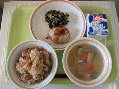 『ハンバーグ』は、ドイツの「ハンブルグ」というドイツの町からついた名前といわれています。19世紀初めにアメリカに移住した移民が、ドイツの「ハンブルグ」で食べられていた形と同じような料理を再現し、その料理に『ハンバーグ』と名前を付けました。『さつま汁』は鹿児島県の郷土料理です。江戸時代に薩摩藩で武士の士気を高めるために行われていた行事で食べられていたのが始まりです。さつまいもと野菜など入れ、みそで味付けました。『小松菜の磯和え』には、西東京市の田倉農家さんから届いた小松菜を使っています。のりと和えて、とてもおいしく仕上がっています。