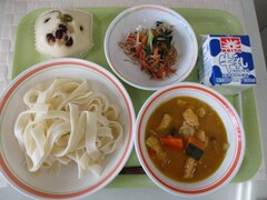 山梨県の北斗市は平成11年から西東京市の姉妹都市になりました。今日の給食では、山梨県の郷土料理の『ほうとう』をいただきます。昔、山梨県では米の栽培が難しく、小麦を栽培していました。そのため、小麦粉を使って麺をつくる文化がうまれ、『ほうとう』が誕生しました。給食ではかぼちゃやきのこなどの野菜、肉がはいった具だくさんの『ほうとう』です。よく味わって食べましょう。