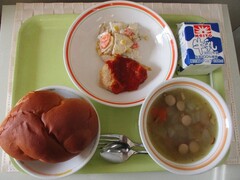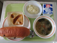 今週末に本町小学校で展覧会があります。今年のテーマは「本町小万博展覧会」で、今週の給食にはさまざまな国の料理が登場します。今日の給食では、オーストラリアで国民食として親しまれている『ミートパイ』です。カフェやコンビニなどあらゆるところで買うことができます。給食では豚肉と大豆、たまねぎなどをトマトソースとともにパイで包んでオーブンで焼きました。『野菜スープ』には、5種類の野菜がたっぷりはいっています。野菜は免疫力を高め、風邪の予防にも効果があります。しっかり食べて、今週も元気に過ごしましょう。