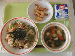 今日の給食は和食の献立です。『栗ごはん』の栗は秋が旬です。日本では縄文時代から食べられていて、私たちが普段食べているのは「種」にあたる部分です。一番外側にあるトゲトゲを「イガ」といい、その「イガ」の中に「3個」の栗がはいっています。栄養面ではデンプンが主成分で、カロリーは高めです。栗の木は「桃栗三年柿八年」といわれているとおり、成長が早く、すぐに大きく育ちます。樹齢20年で幹の太さが20〜30センチくらいまで太くなるそうです。しっかり食べて、11月も元気に過ごしましょう!