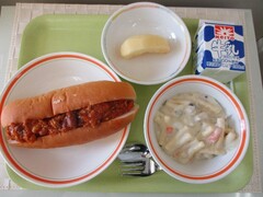 今日の給食は洋食の献立です。『チリコンカンドッグ』の「チリコンカン」は、アメリカの南部のテキサス州でよく食べられている料理です。ひき肉と玉ねぎを炒めて、トマト、チリパウダー、豆類などを加えて煮こんだものです。本来はチリ(唐辛子)の辛味が効いたスパイシーな料理ですが、給食では食べやすいようにつくっています。『りんご』は秋から冬が旬の果物です。りんごを触ると皮がベタベタしていますが、これは完熟していて食べ頃になったしるしです!