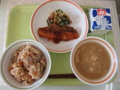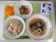 今日の給食は和食の献立です。『新米』とは、その年に収穫され、12月31日までに精米・包装されたお米をいいます。新鮮で「つや」「香り」「粘り」がよく、とてもおいしいです。『いりこのくぎ煮』は、小さなカタクチイワシを甘辛いタレでじっくりと煮詰めた料理です。煮詰めることで、いりこが釘のように曲がって見えることから「くぎ煮」と呼ばれるようになりました。よくかんで食べましょう。