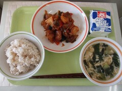 今日の給食の『魚の酢豚風』には「メルルーサ」という魚を使っています。メルルーサは「タラ」の仲間で南半球にいる魚です。水深300m〜1kmあたりにいるので深海魚に分類されます。白身の魚の中でもあっさりとした味で、骨も少なくとても食べやすい魚です。日本では、給食でも多く使われていますし、ファーストフードのフィッシュバーガーやお弁当の白身魚のフライにも使われている魚です。私たちの食生活でとても身近な魚となっています。