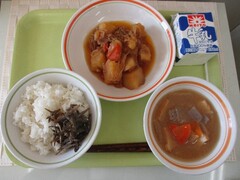 福島県の会津郡下郷町は、旧保谷市が昭和55年から西東京市の姉妹都市として交流を行ってきました。今日の給食は、福島県の郷土料理をいただきます。『会津ソースかつ丼』はとんかつにかけるソースが甘めで、給食でも砂糖やケチャップで甘みをつけたソースになっています。『いかにんじん』とは、細切りにした「するめいか」とにんじんを甘いタレで味付けしたものです。『こづゆ』とは貝柱でだしをとり、さといも、にんじん、お麩などの食材がはいった汁物です。会津ではお正月などで食べられる料理です。よくかんで、味わって食べましょう。