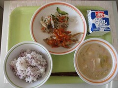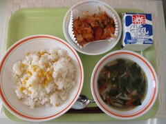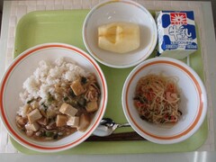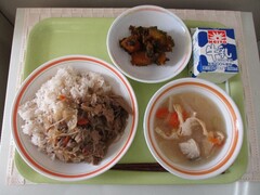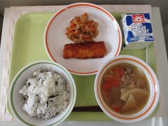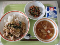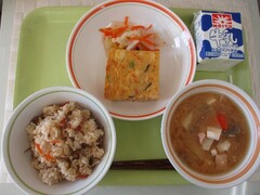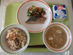 今日の給食は和食の献立です。『どんどろけ飯』とは鳥取県の郷土料理で、油で炒めた豆腐を混ぜた炊き込みごはんのことです。「どんどろけ」とは、鳥取県の方言で「かみなり」という意味で、豆腐を炒める時の音が雷に似ていることからこの名前が付いたそうです。『さわらの西京焼き』の「さわら」はサバの仲間ですが、身がやわらかくくせのない魚です。冬の「さわら」は産卵前のため脂がたくさんのっていて、甘みがありとても美味しいです。よく味わって食べましょう。