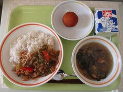 今日の給食は中国の料理です。『チンジャオロース丼』の「チンジャオ」とはピーマン、「ロース」とは肉の細切りのこ