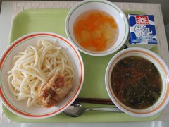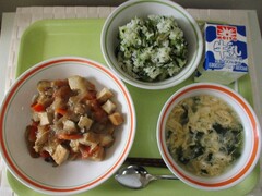今日の給食は和食の献立です。『生揚げと野菜のみぞれ煮』の生揚げは、豆腐を油で揚げたものです。揚げることで豆腐のうま味がギュッと中につまります。煮込んだり、タレを絡めたりすると、味がよく染み込んでとてもおいしくなります。「みぞれ煮」は大根おろしをたっぷりと使った料理です。煮汁に大根おろしを加えることで、食材が柔らかく煮え、味もまろやかになります。よく味わって食べましょう。