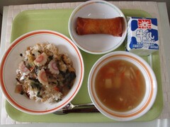 今日の給食も野菜がたっぷりはいった献立です。健康のために1日に350gの野菜を食べることが望ましいとされています。給食では毎日多くの野菜を使っていますが、今日はどのくらいの野菜がはいっていると思いますか?『あんかけチャーハン』は6種類、『キムチ春巻』は2種類、『豆腐と中華スープ』には4種類はいっており、合計で一人180gの野菜を食べる計算になっています。1日に必要な約半分はたべていることになりますね。野菜はビタミン類、食物繊維、カロテンなどの栄養素が豊富に含まれていて、体調を整える働きをしてくれます。しっかり食べるようにしましょう!