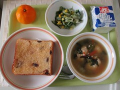 今日の給食はパンの献立です。『レーズンシュガートースト』は、ぶどうがはいった食パンに砂糖とマーガリンを混ぜて、塗りオーブンで焼きました。『大根サラダ』の大根は、冬が旬の野菜です。大根は大昔から日本中で作られていて、にいろいろな色、形、大きさのものがあります。最も小さいものは直径2cmくらいのラディッシュ、世界一大きいものは桜島大根で、なんと20〜30kgにもなるそうです。大根は根の白い部分を食べる野菜ですが、葉や皮も食べることができます。今日の大根は市内の田倉農園さんから届きました。できるだけ残さず食べましょう。