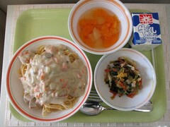 今日の給食は洋食の献立です。『サーモンクリームスパゲティ』には鮭がはいっています。魚はその肉の色でタラやタイなどの「白身魚」、マグロやサバなどの「赤身魚」に分けられます。また、「赤身魚」のうち、背中が青く見える魚のことを「青魚」といい、サバやイワシが該当します。では、「鮭」は赤身魚と白身魚とどちらに分類されるでしょうか?答えは「白身魚」です。鮭の子どもは赤くありませんが、エビの仲間のオキアミというエサとして食べているため、オキアミが持つ赤色の色素が体にたまり、成長にするにつれ、だんだん身が赤くなっていきます。