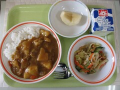 今日の給食は「アルファ化米のカレーライス」です。「アルファ化米」とは一度炊いたごはんを急速に乾燥させたもので、非常食として、水やお湯を入れるだけで食べられるお米です。お湯で約20分、水で1時間戻すだけで食べることができ、栄養価は普通のお米と同じです。果物の『ラフランス』はフランス原産の洋なしです。下が大きく上が小さな球型で香りが強く甘い「なし」です。よく味わって食べましょう。