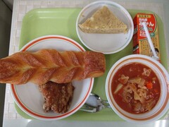 今日12/24はクリスマスイブです。クリスマスはキリスト教の行事で、イエス・キリスト教の誕生日とされています。日本では鶏肉をよく食べますが、アメリカでは七面鳥、ドイツではシュトーレンというパン、フィンランドではサーモン料理を食べるそうで、国によってクリスマスに食べるものが違うようです。今日の給食は洋食の献立で、カレー風味の『フライドチキン』、星形のマカロニがはいった『ミネストローネ』、ヨーグルト、クリームチーズが、いちごジャムがはいった『ヨーグルトケーキ』をいただきます。2学期最後の給食を味わってください。