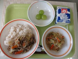 今日の給食は『ねぎ塩豚丼』の「豚肉」についてです。豚肉は、疲れた体を助けてくれるビタミンB1が含まれています。ごはんなどに含まれる糖質をエネルギーに変える働きがあり、疲労回復に効果的です。豚肉には、筋肉や内臓、骨をつくるのに必要な良質なたんぱく質が豊富に含まれています。成長期に十分な体をつくるのに欠かせない大事な栄養素です。果物の『ぶどう』は秋が旬で、山梨県産の「シャインマスカット」という品種です。香りと甘みが特徴で、種なしで皮が薄いので皮ごと食べることができ、最近特に人気の高い品種です。よく味わって食べましょう。