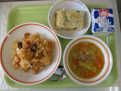今日の給食はスペインの料理です。『パエリア』はスペイン東部のバレンシア地方発祥の料理です。バレンシア地方はスペインの米所として知られており、鍋で豪快につくる習慣が古くから根付いています。今ではスペイン全土で食べていますが、スペインのどの地方で暮らしいるかで使う具材が変わります。『コシード』はスペインの伝統的なスープです。豆類、肉、野菜を入れてじっくり煮込みつくりました。よくかんで食べましょう。
