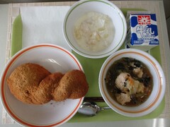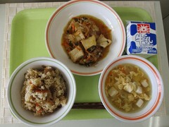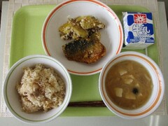 今日の給食は主食が魚料理の献立です。牛肉や豚肉の脂肪をとりすぎると血管が固まる生活習慣病が起こりやすくなります。一方で、魚に含まれる脂肪はさまざまな健康効果があります。なかでも、サバ・サンマ・イワシなどに多く含まれる成分には血液をサラサラにしたり、脳を活性化したり、記憶力や学習能力を高める働きがあります。これらの成分は体内で作り出せないので、成長期の中学生には積極的に食べてもらいたい食品のひとつです。『呉汁』とは、水に浸してやわらかくした大豆をすりつぶして絞ったものをいれたみそ汁のことです。よく味わって食べましょう。