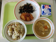 今日の給食は和食の献立です。『きんぴらごはん』の「きんぴら」は日本に昔からある料理の1つで、細切りした野菜を砂糖と醤油で甘辛く炒めたものです。きんぴらに使われているごぼうは食物繊維が豊富で噛み応えがある野菜です。『むらくも汁』は溶き流した卵が汁の中に広がり、それが空にうっすらなびく「むらくも」のように見えることから付いた名前です。汁がふわふわに仕上がるポイントは、最初に汁に片栗粉でとろみをつけてから、卵を流し入れるとふわふわになります。