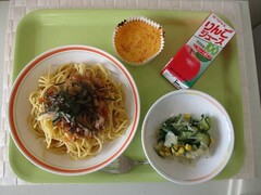 『きのこ和風スパゲッティ』にはいっているきのこは、スーパーなどにも1年中並んでいますが、旬は秋です。きのこは天然のものと栽培ものがあり、スーパーなどでよく見かける多くのものは栽培ものになります。栽培技術が進んできたことにより、1年中食べることができます。豊富な食物繊維のほか、うまみ成分や香り成分が含まれています。デザートの『オレンジスフレ』の「スフレ」とは、卵の白身でつくったメレンゲに様々な材料を混ぜて焼いたものです。今日の給食では、卵、クリームチーズ、砂糖、ミカン、生クリーム、小麦粉などをいれて手作りしました。よく味わって食べましょう。