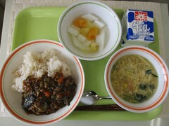 今日の給食は沖縄の料理です。『タコライス』とはメキシコ料理の「タコス」の具をごはんの上にのせて一緒に食べる沖縄で生まれた料理です。「タコス」は肉や野菜とチーズをトルティーヤというとうもろこしから作られた薄焼きのパンにはさんで食べる料理で、沖縄ではトルティーヤの代わりに温かいごはんの上にタコスをのせた『タコスライス』が定番となりました。『あおさ汁』の「あおさ」とは、海藻の仲間です。海藻はエネルギーが少ないものの、カルシウムや鉄などの栄養素が含まれています。お腹の中をきれいにする働きもあります。
