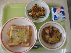 今日から2学期の給食が始まります。今日の給食はアジアの料理です。「ポーロ―パオ」とは、日本のメロンパンに似た香港でよく食べられているパンです。小麦粉、砂糖、マーガリンでつくった生地をパンの上に塗ってオーブンで焼きました。「酸辣湯」とは中国の四川料理の一つで、酢の酸味と唐辛子やこしょうの辛みをきかせ、卵を流し入れたスープです。酢の酸味は、疲れた体を回復させてくれる働きがあります。主食、主菜、副菜、果物をバランスよく食べ、2学期も元気に過ごしましょう。