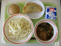 今日は保谷中学校で人気の『ジャンボ餃子』です。餃子はもともと中国から日本に伝わってきた料理で、今では日本各地にご当地餃子が登場するくらいの人気です。中国では縁起の良い食べ物とされていて、旧正月やお祝いの席で食べられるそうです。給食では、豚ひき肉、みじん切りにしたキャベツ・ニラを合わせ、直径15cmの大きな皮に包み、油で揚げました。よく味わって食べましょう。