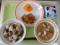 今日の給食は和食の献立です。『さんまのかば焼き風ごはん』の「さんま」は、秋が旬です。秋に獲れるサンマは、夏にたくさんエサを食べて太っているので、脂がのっていてとてもおいしいです。とれたての新鮮なサンマはピカピカに光って身がはっています。果物の『柿』も秋が旬です。「柿が赤くなると、医者が青くなる」ということわざがあるように、柿にはたくさんのビタミンAとビタミンCが含まれており、風邪を予防する働きがあります。しっかり食べて、今週も元気に過ごしましょう。