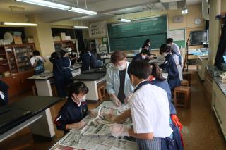 期末テストも終わり、昨日の理科の授業では、「イカの解剖」を行いました。ハサミをつかって、班のメンバーで協力し合いながら、上手にできました。
