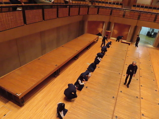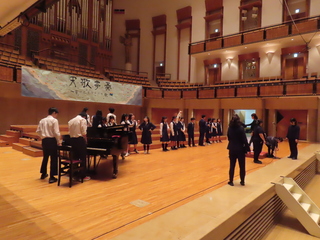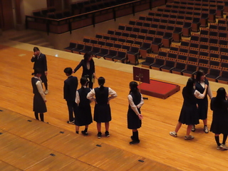 ピアノの位置や角度、指揮者からの見え方、学年合唱の幅の確認など、綿密に行ってるところでした。