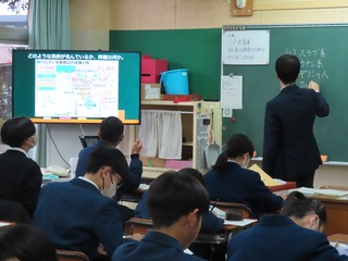 ここでも提示された資料からどんなことがわかるのかという先生からの問いかけに、反応を見せる生徒たちです。