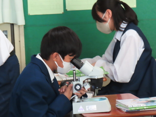 顕微鏡のようすを先生に見せている生徒もいます。