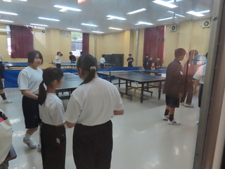 卓球部です。先輩からの説明を聞いて、これから練習に入るところでしょうか。