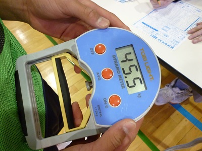 両足をそろえて踏み切って距離を測定。1年生男子全国平均は180センチ程度です。