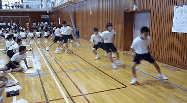 30秒の相田に上体起こしをします。中三男子平均27回程度、中三女子平均20回程度。