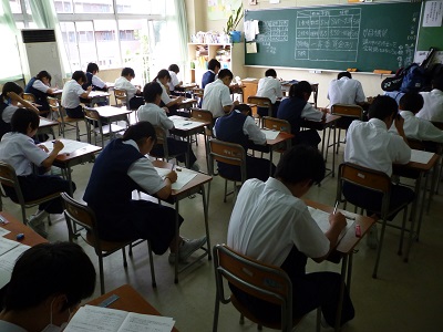 2学期の定期考査が行われました。中間考査としては、1年生にとっては前回1学期は復習確認テストで各教科30分一日だけの実施でしたが、今回は50分5教科2日間の実施となりました。