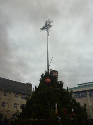 今年は天候が心配されましたが、和太鼓の雄大な音に合わせた点火の午後1時には風もなく絶好の日和となりました。地域の方が持ち寄った正月飾りをボランティアの中学生が受け付けて、金具などを外した後はどんど焼の竹と一緒にくみ上げた中にいれて燃やしました。また、お汁粉や綿飴なども振る舞われました。