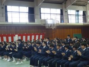 校歌紹介 新入生は在校生の方へ向いて聴きます。