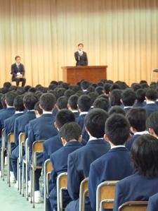明保中学校に昨年度まで勤務されていた先生や主事さん方の離任式が体育館で行われました。壇上でご挨拶を頂き、生徒の代表から感謝の言葉が贈られました。