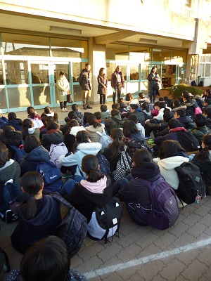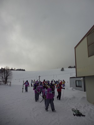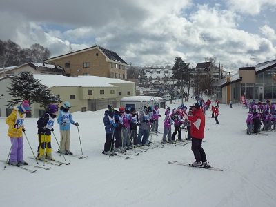 「シュプールを描いてゲレンデマジックにときめいて」をスローガンに1年生のスキー教室が始まりました。実行委員や各係を中心に何ヶ月も前から準備してきた宿泊行事です。生徒たちは朝早くからの出発にうきうきしながら学校に集まってきました。