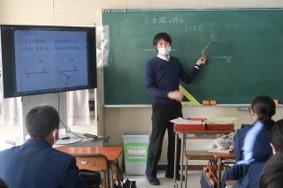 数学の授業です。黒板で説明していますが、問題文は大型ディスプレイに提示されています。