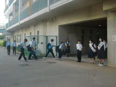 「訓練、訓練。ただいま、強い揺れを感じました。」避難訓練放送がお昼休みに入りました。教室では机の中、廊下にいた生徒はそれぞれの場所で、自分自身を守るため、揺れている間は、きちんと頭を守り防護姿勢を取っていました。